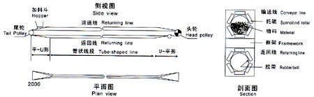 芯體以高強力帆布或鋼絲繩為骨架,配以高強度、高耐磨優質膠料為上下覆蓋層,工作時膠帶由平面漸變為U形,卷成管狀以實行封閉式輸送。